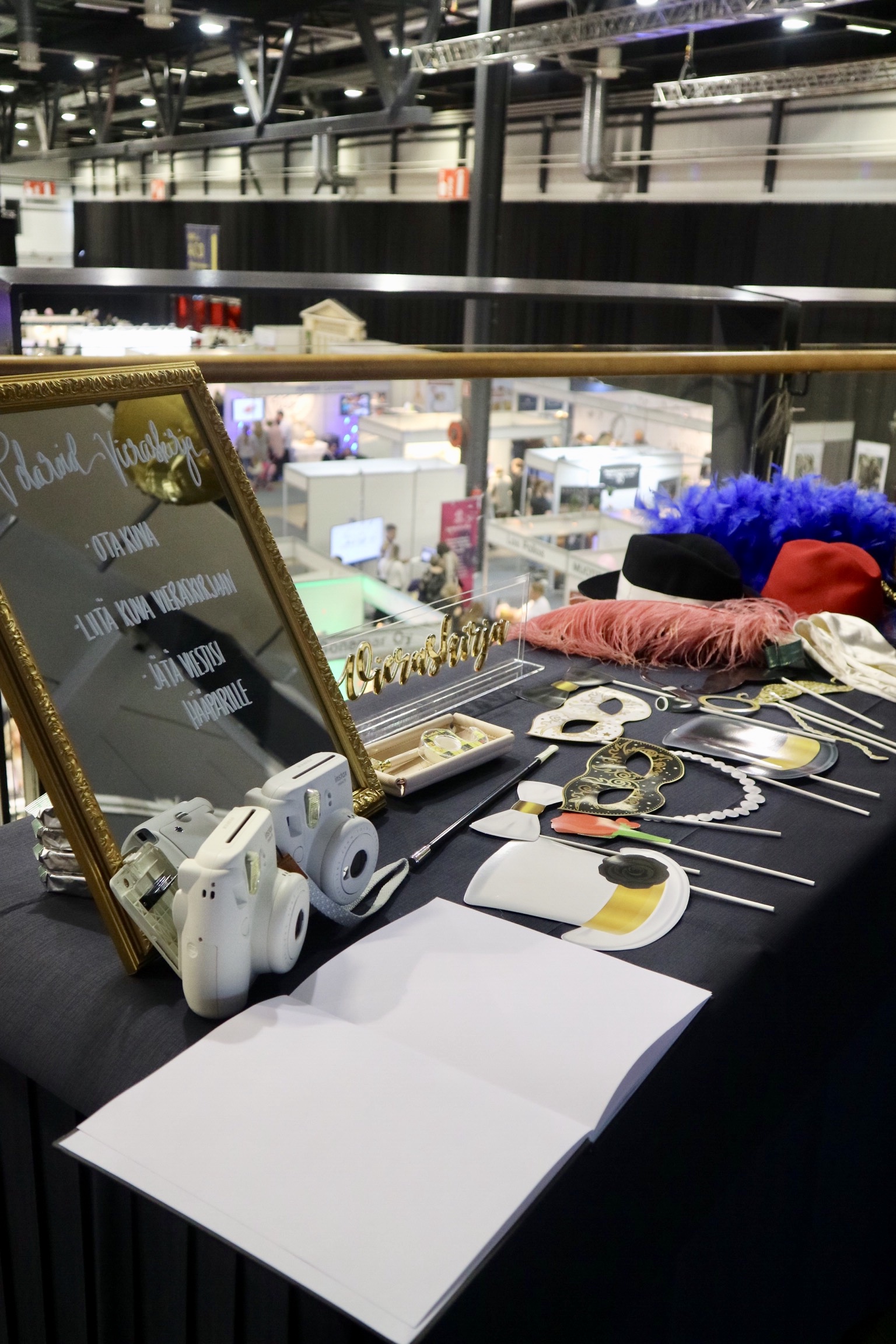 Tilaan tullessa oli heti alkuun pöytäkartta, joka oli kultakehystettyyn peiliin asetettu. Kuvausseinäksi oli laitettu ihana kultainen paljettikangas ja höyheniä, jonka vieressä oli pöydällä erilaisia asusteita ja Instaxin Fujifilm kameroita Polaroid vieraskirjaa varten. Meidänkin häihin on tulossa saman tyylinen Polaroid vieraskirja, joten oli ihanaa nähdä konkreettisesti miltä pöytä voisi näyttää.