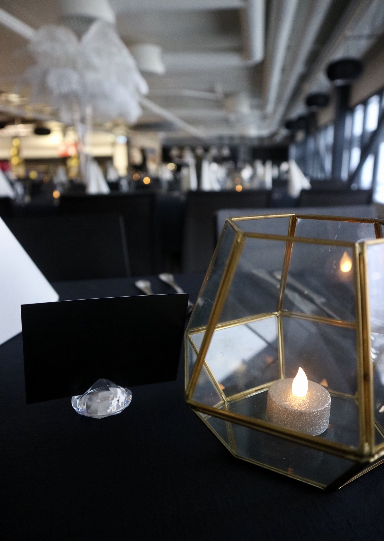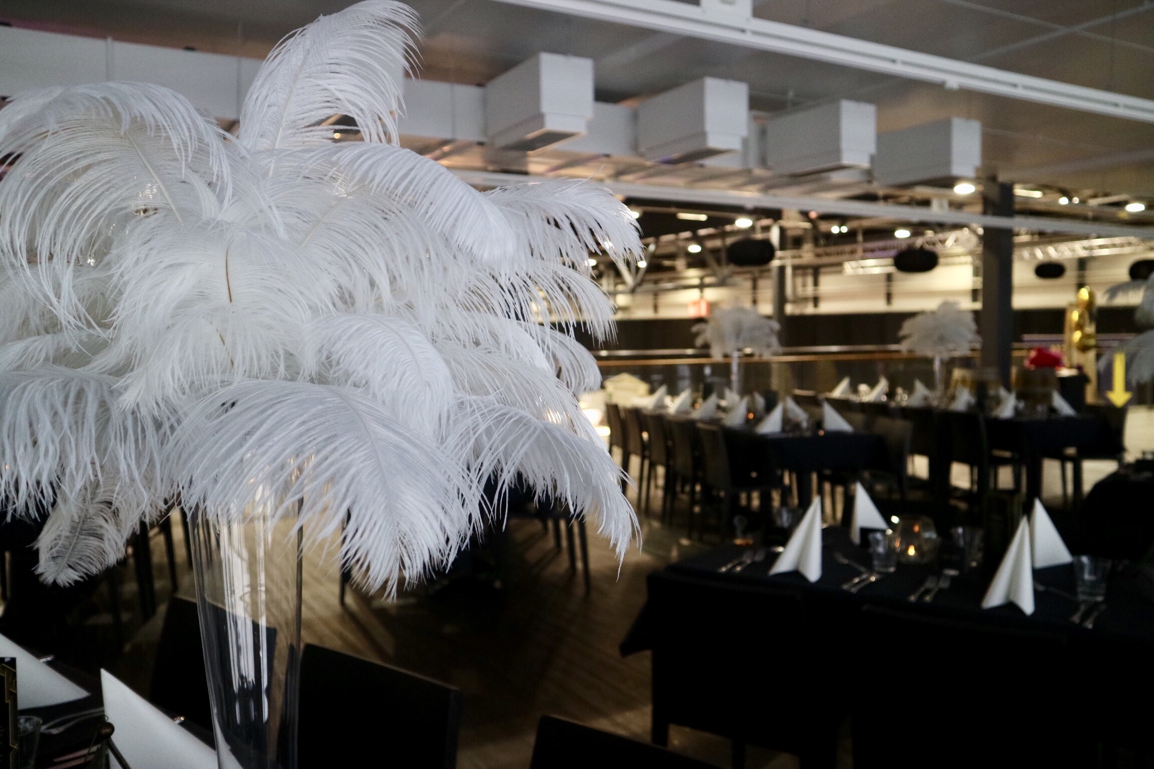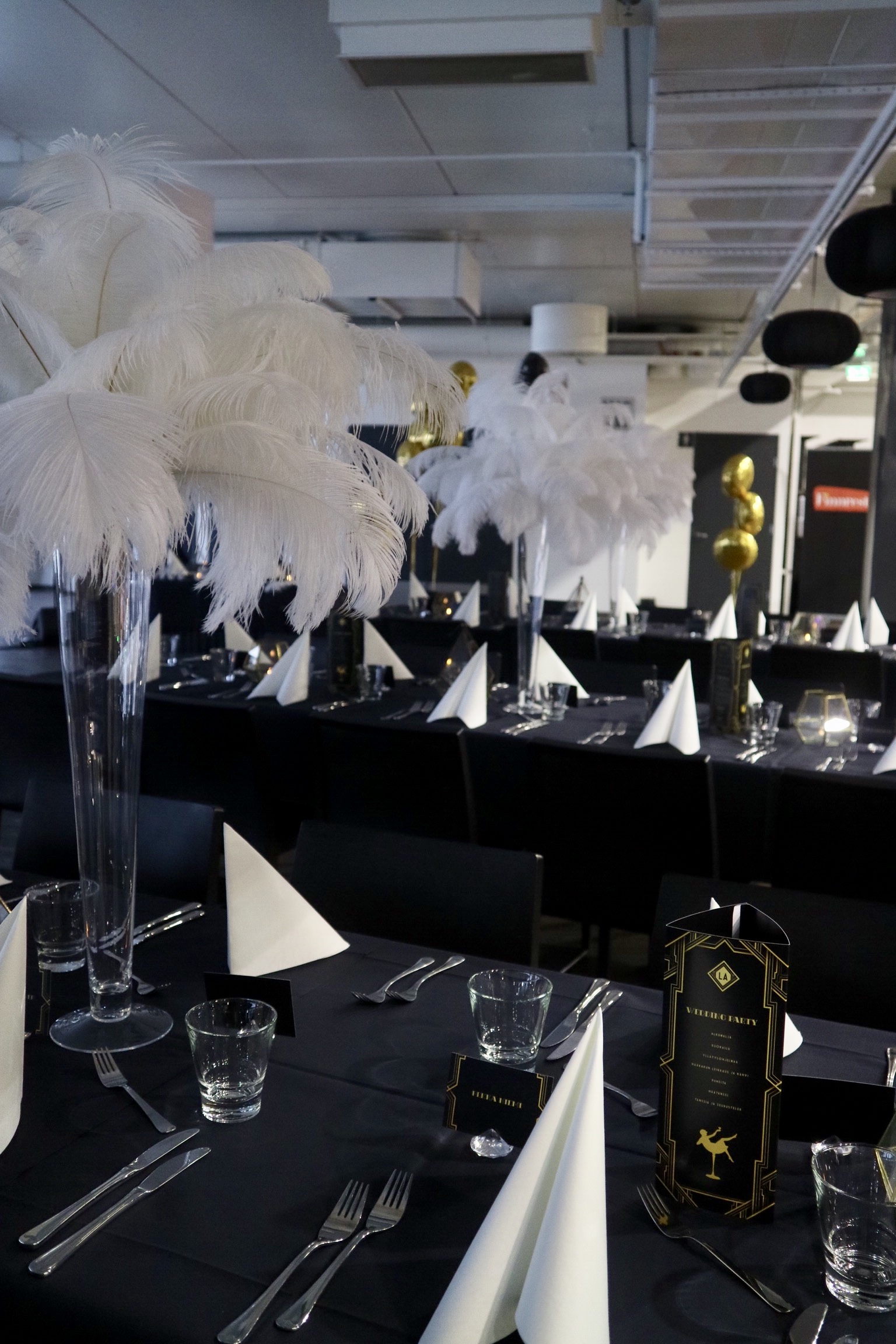 Sain kunnian tutustua tilaan ja somistukseen ennen Tähtiparin juhlan alkua ja ihastuin täysin! Juhlatila oli somistettu 1920-luvun/Gatsby tyylisesti, josta ei puuttunut höyheniä, kultaa ja klassisia linjoja.