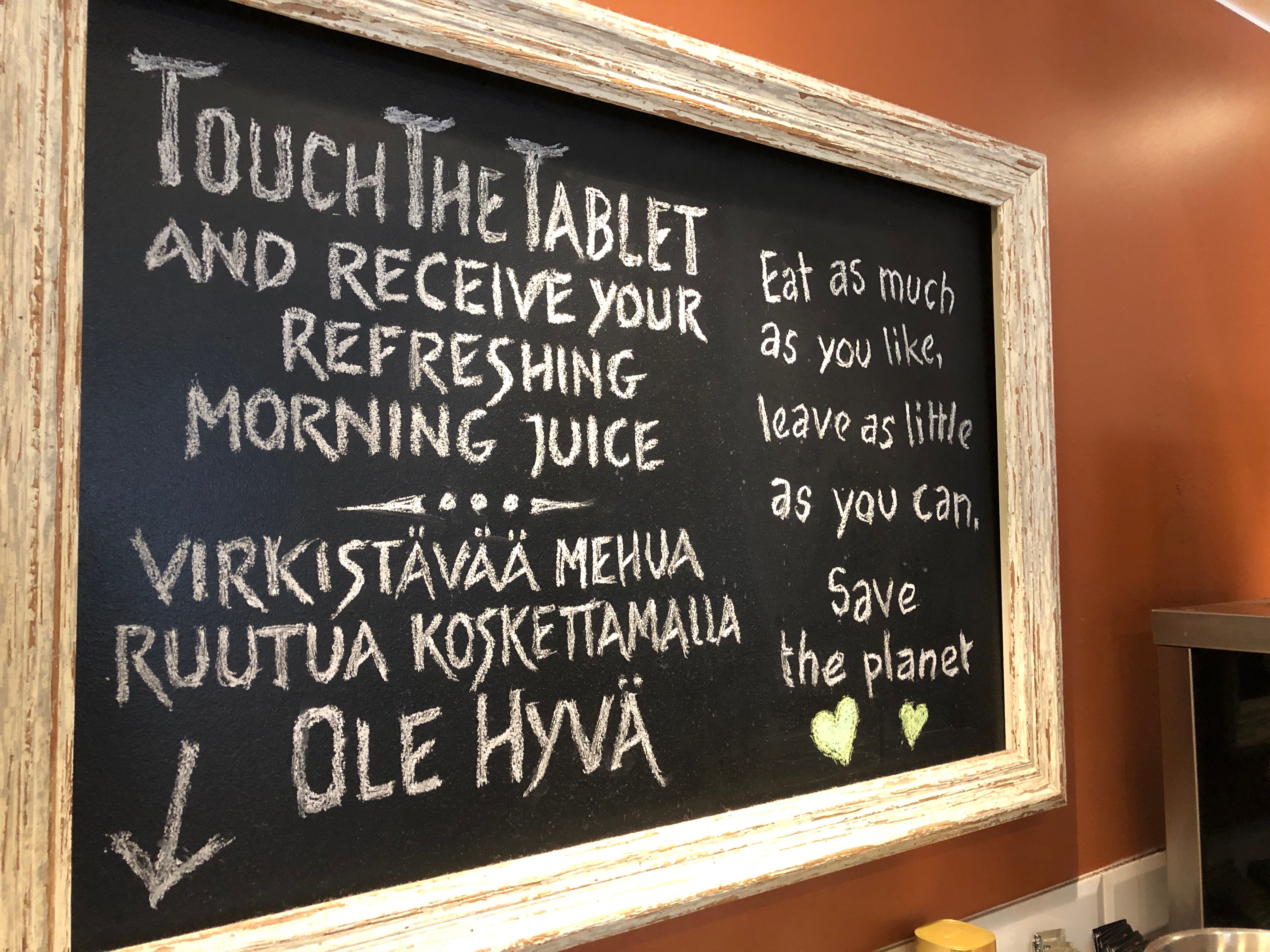 Sviittiin saavuttuamme ihailimme hetken aikaa näköaloja, joita pääsi ihastelemaan kolmeen ilmansuuntaan. Lisäksi pidimme kovasti siitä, että sviitissä oli kotimaisia tuotteita kuten esimerkiksi Marimekon Oiva/Siirtolapuutarha mukeja. Siirryimme pian sviitistä takaisin alakerran Kitchen & Table ravintolaan extempore illalliselle.