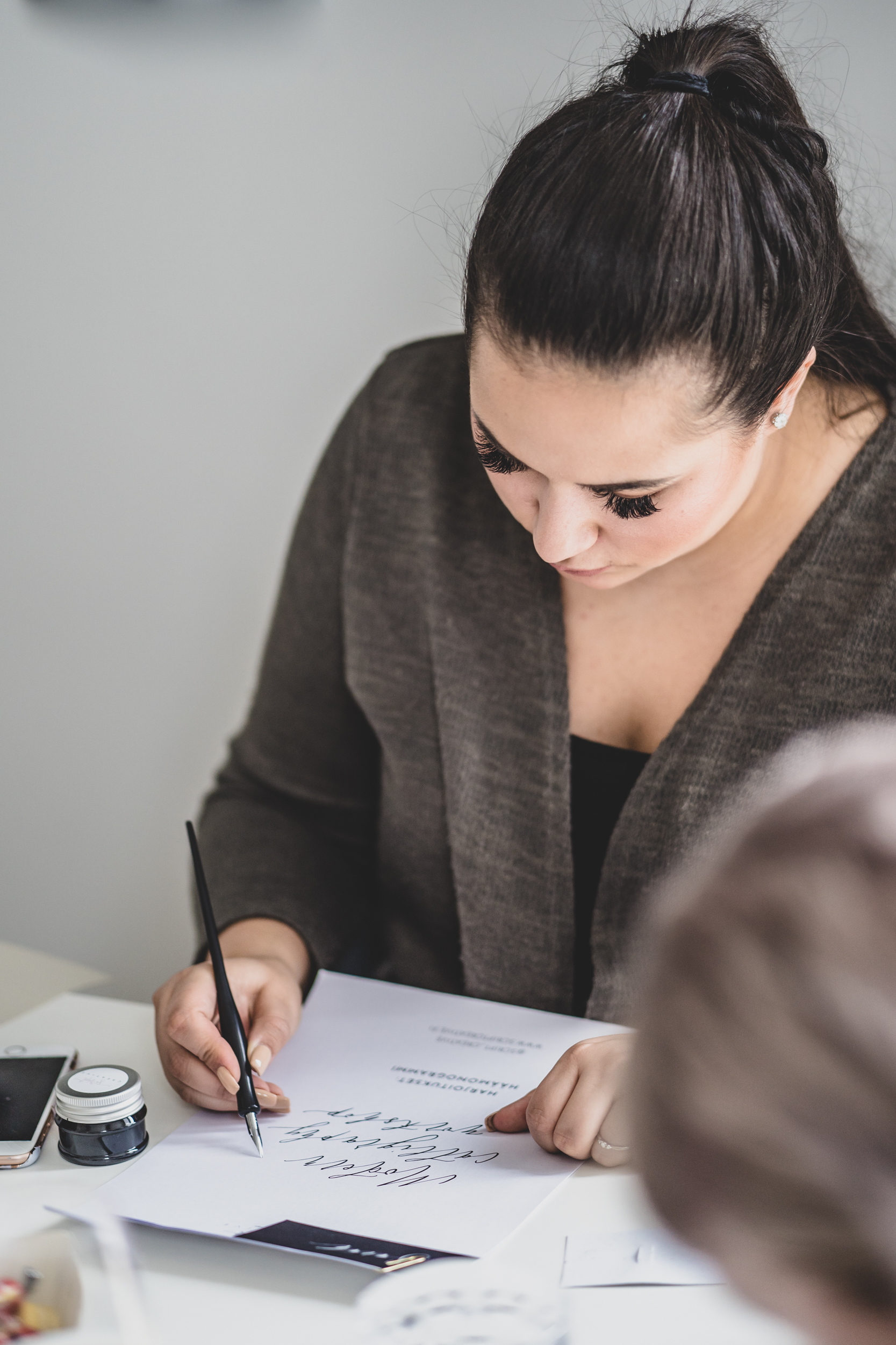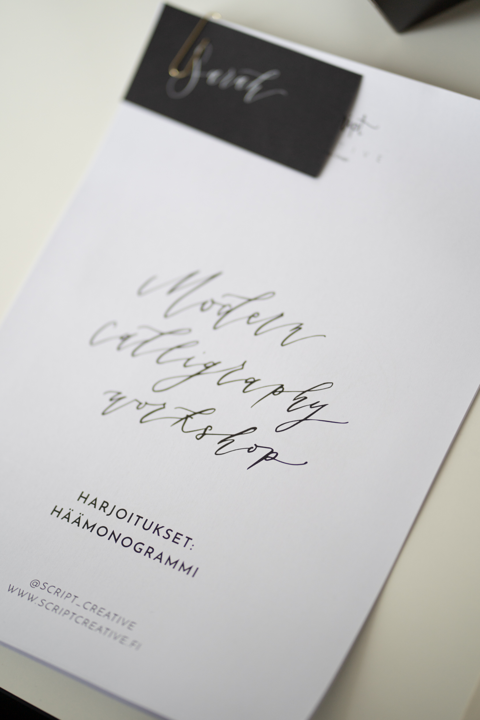Naminan esittelyn jälkeen pääsimme tutustumaan kalligrafian saloihin tunnin mittaisella kalligrafian alkeet workshopissa, jota ihana Script Creativen Aini tuli meille pitämään. Aini oli kasannut meille materiaalin, jossa pääsimme harjoittelemaan ohuiden ja paksujen viivojen tekoa, kirjaimia ja kirjainyhdistelmiä. Yhtäkkiä sviitissä vallitsi hiljaisuus, kun kaikki keskittyivät tekniikan sujuvuuteen. Vaikka omasta puolestani voin sanoa, että tekniikka oli itselleni hankala, oli se kuitenkin hyvin rauhoittavaa tekemistä. Kalligrafiakurssia voin suositella paitsi morsiamille ja sulhasille, myös polttareihin!