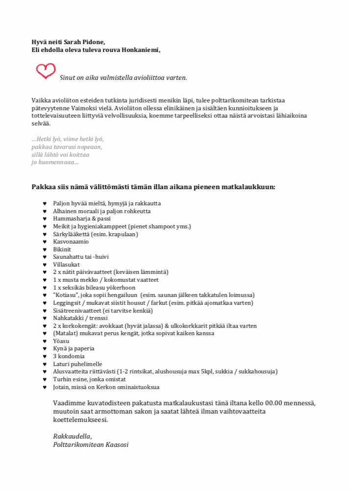 Itse pidän polttarikirjeen ideasta ja olisikin ollut todella outoa, mikäli Kerkon olisi pitänyt minulle pakata tavarat mukaan. Nyt sain hieman vihiä siitä, että polttarit voisivat kestää toiveeni mukaisesti kauemmin kuin yhden yön verran! Jännitän kuitenkin mitä ohjelmaa meille on keksitty, varsinkin kun pitäisi olla alhainen moraali, heh!