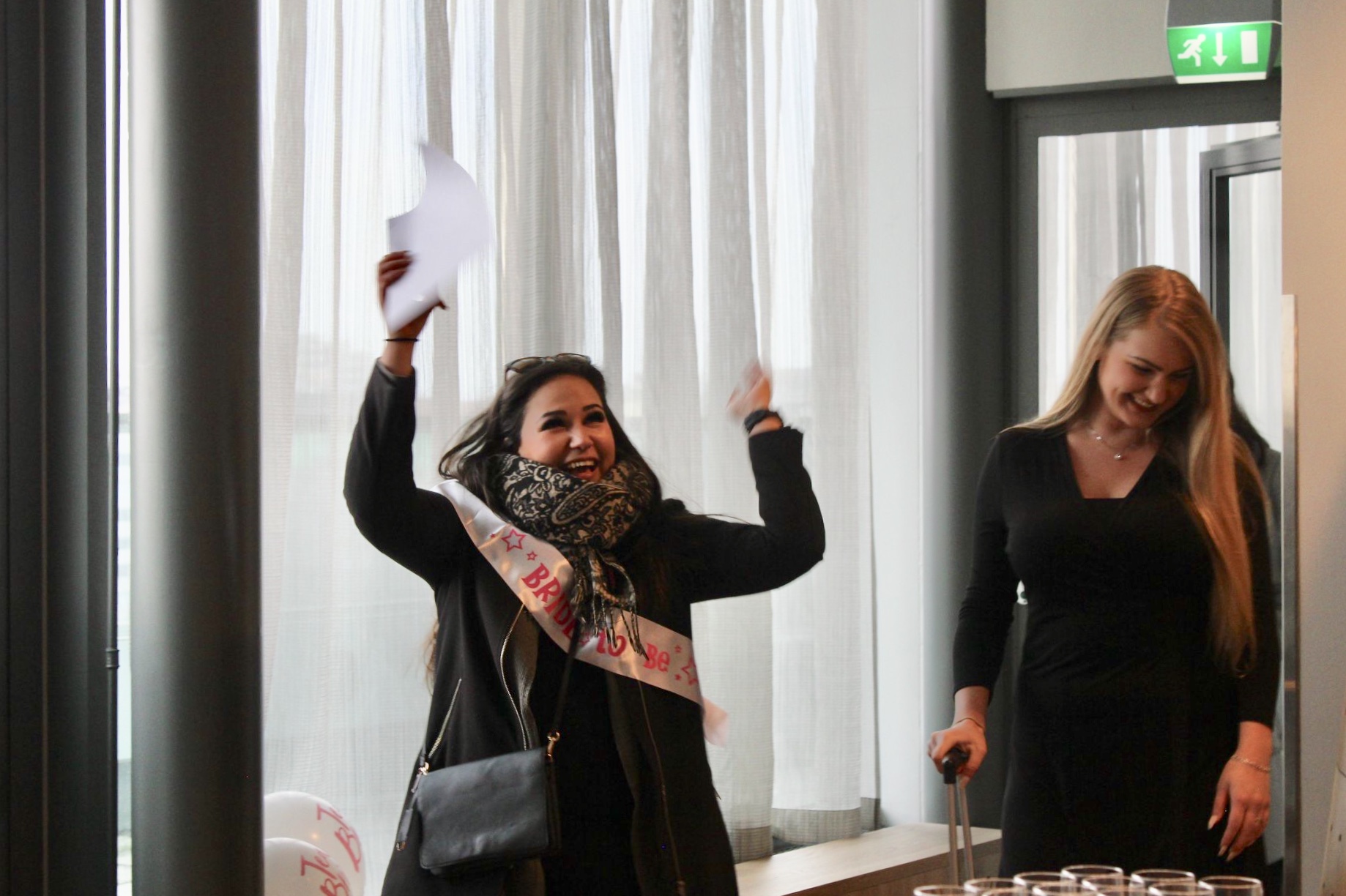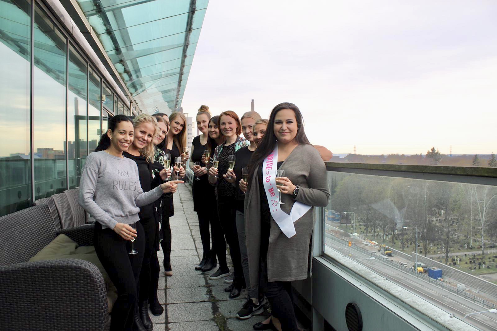 Olimme kaasoni/serkkuni työpaikan saunatiloissa, joissa loputkin ihanat leidit minua odottivat! Jännitykseltäni en saanut varmaan siinä hetkessä muuta sanottua kuin moi ja skannattua keitä kaikkia siellä oli – heh! Heti moikkaamisten jälkeen sain lasin kuohuvaa käteeni ja skoolasimme ihanien naisten kanssa polttareitteni alkaneen.