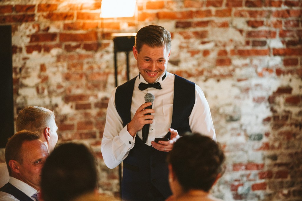 Hääpäivään kuuluu usein myös puheet ja niitä kuultiin myös meidän häissämme tasaiseen tahtiin. Olimme sopineet seremoniamestarina toimivan bestmanin kanssa, että puheita saa alkaa pitämään siinä kohtaa kun viimeinenkin pöytäseurue on saanut hakea buffetista ruoka-annokset ja saaneet syödyksi. Minulle tämä oli erityisen tärkeää, sillä tiedän miten inhottavaa on istua nälkäisenä ruoka lautasella uskaltamatta alkaa syömään puheiden alkaessa.