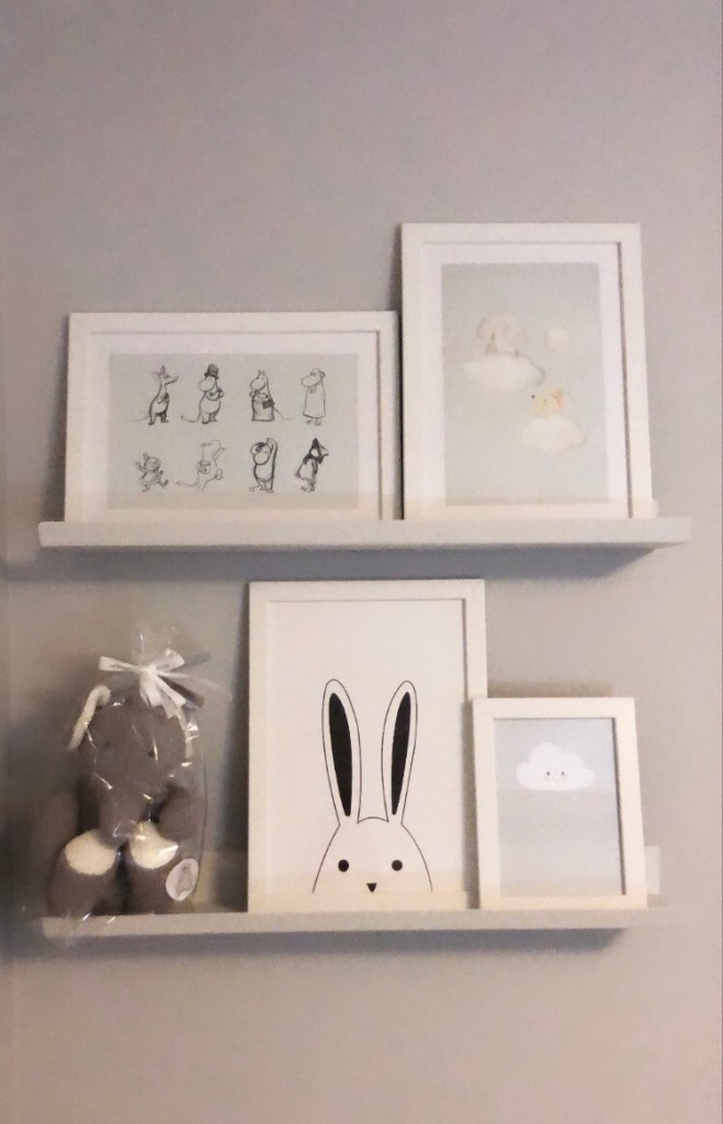 Vauvan huoneeseen halusin sellaisia julisteita, joita voisimme pitää seinillä pitkään ja olisivat mahdollisimman tyylikkäitä ja selkeälinjaisia. Siksi seinille valikoituikin In the Clouds No2, Cloud, Rabbit Peekaboo ja Moomin Characters No2.